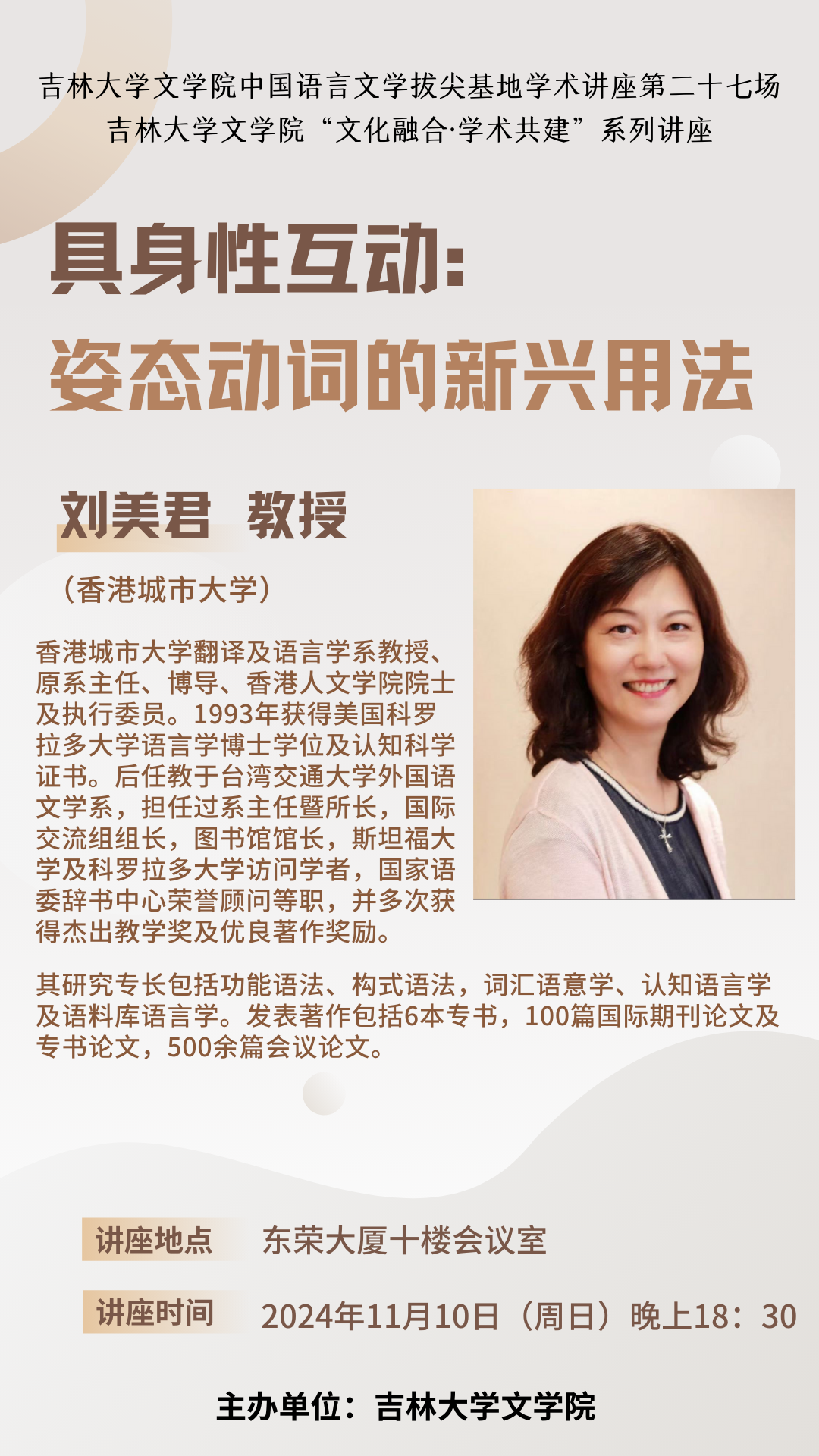刘美君 为香港城市大学翻译及语言学系教授、原系主任、博导、香港人3377官方网站_3377(中国)院士及执行委员。1993年获得美国科罗拉多大学语言学博士学位及认知科学证书。后任教于台湾交通大学外国语文学系,担任过系主任暨所长,国际交流组组长,图书馆馆长,斯坦福大学及科罗拉多大学访问学者,国家语委辞书中心荣誉顾问等职,并多次获得杰出教学奖及优良著作奖励。其研究专长包括功能语法、构式语法,词汇语意学、认知语言学及语料库语言学。发表著作包括6本专书,100篇国际期刊论文及专书论文,500余篇会议论文。