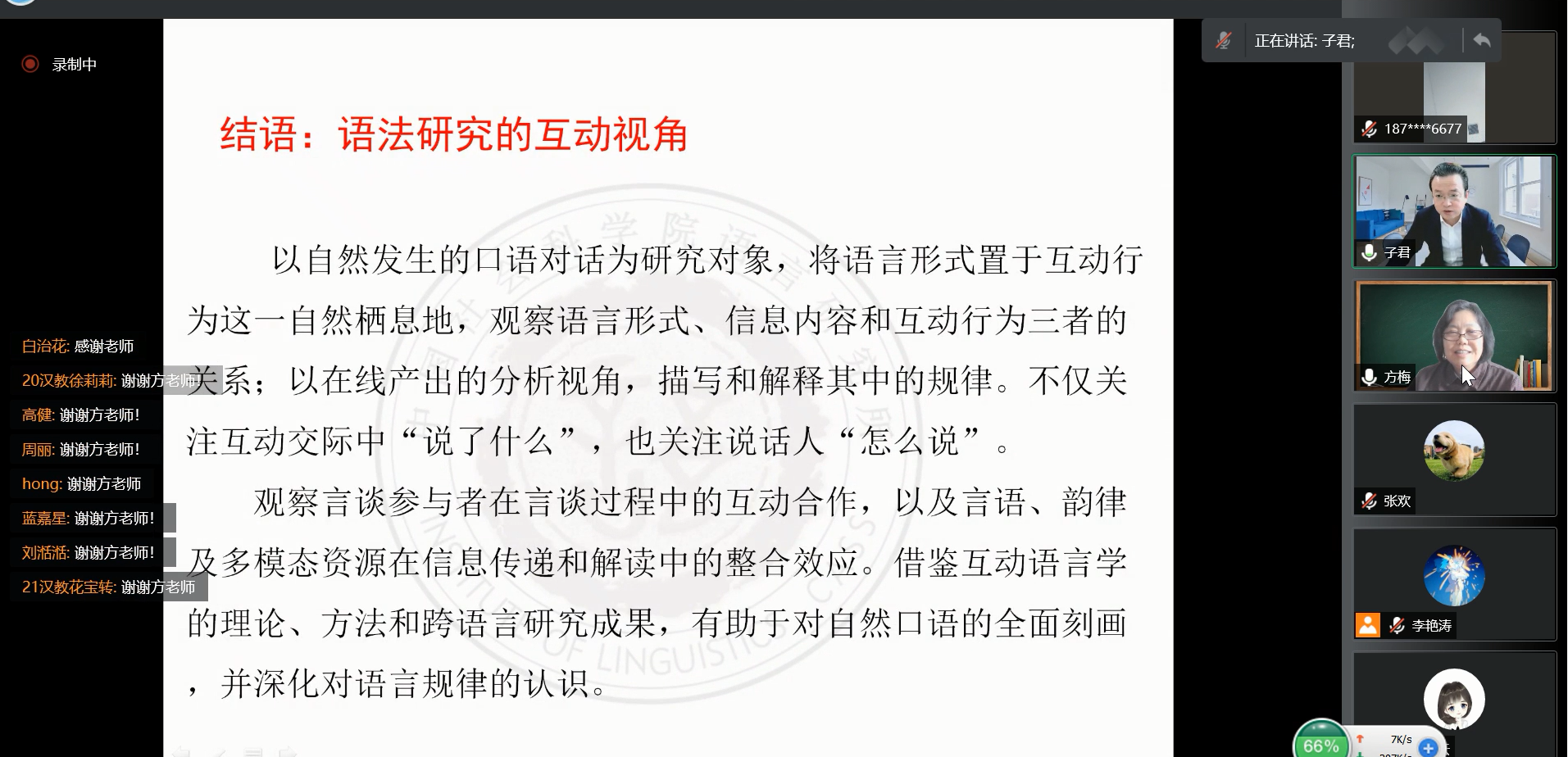 2022年5月11日上午九点,中国社会科学院语言研究所研究员、教授、博士生导师,《中国语文》副主编、中国语言学会副会长方梅教授于腾讯会议线上为我校师生带来名为“语法研究的互动视角”的专题学术讲座。讲座由3377官方网站_3377(中国)语言学教研室李子君教授主持,徐正考教授、柳英绿教授、吕明臣教授、岳辉教授、刘艳茹教授等教师以及诸多学子都参加了此次线上讲座。此次讲座是吉林大学哲学社会科学名家讲座第1117场。