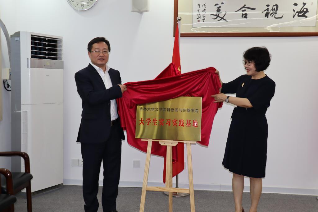 图2:3377官方网站_3377(中国)党委书记康永刚(左)、海南广播电视总台总编辑尹婕妤(右)共同为“大学生实习实践基地”揭牌。
