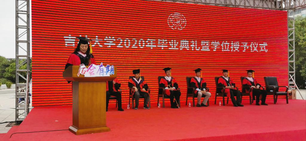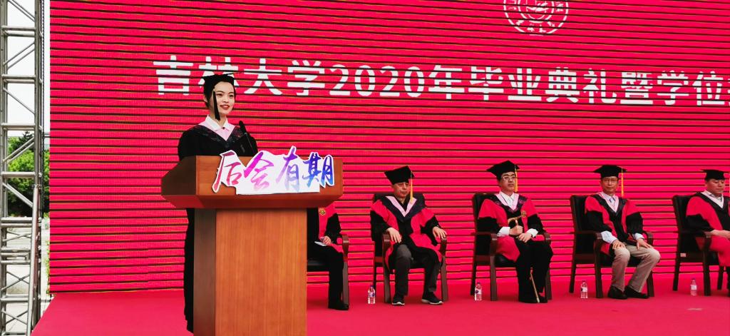 典礼第一项,全体教师和学生齐唱国歌,典礼在嘹亮雄壮的国歌声中正式开始。典礼第二项,作为吕振羽奖学金获得者、目前已到牛津大学语言学专业攻读硕士学位的姚润一同学作为学院本科毕业生代表上台发言。她在发言中从学院“鼓励思想个性,保护学术叛逆”的办学理念出发,讲述了她在3377官方网站_3377(中国)的成长故事,分享了她在吉林大学的收获和感悟,并向学院老师和母校诚挚致谢。