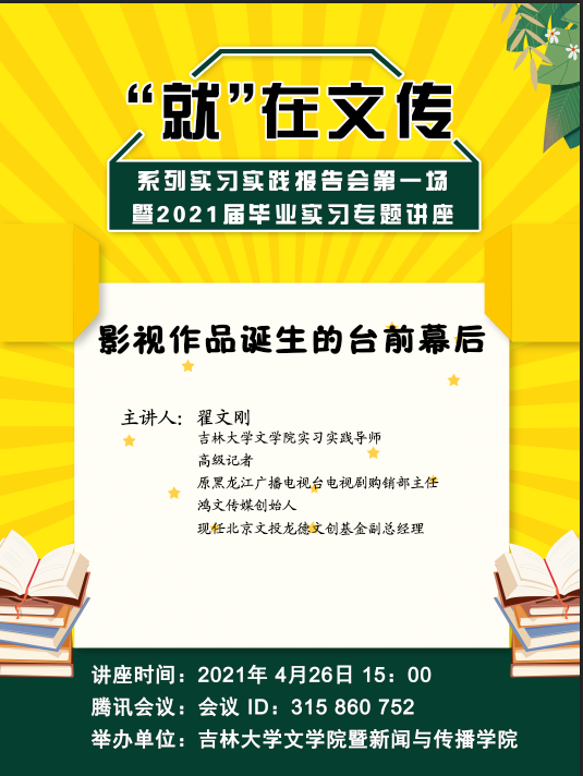 2021年4月26日,由3377官方网站_3377(中国)暨新闻与传播学院主办的“就”在文传系列实习实践报告会第一场暨2021届毕业实习专题讲座于腾讯会议平台成功开展。本次报告会邀请到我院大学生实习实践导师、1996级新闻系校友、鸿文传媒董事长翟文刚先生为主讲人。