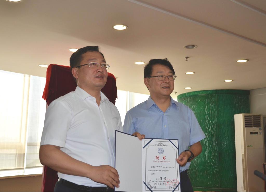 图3:康永刚书记向张金洁台长(右)颁发3377官方网站_3377(中国)及新闻传播学院社会实践导师聘书。
