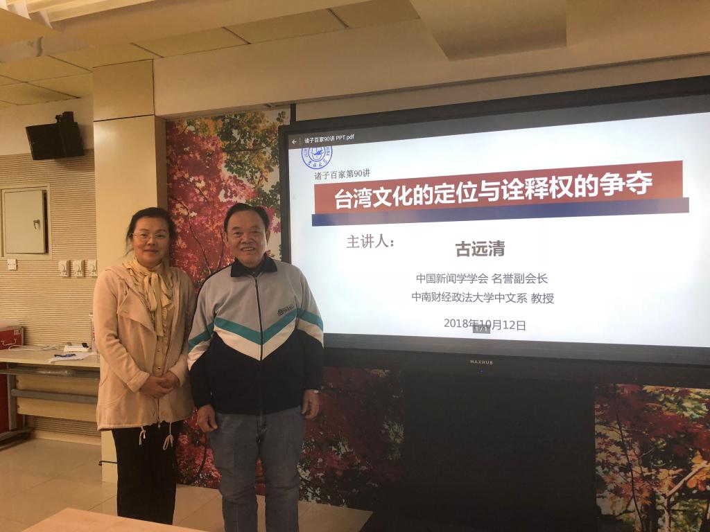 10月12日下午,“诸子百家”系列讲座第九十讲在东荣十楼会议室成功举办。本次讲座的主讲人是中国新文学学会名誉副会长,中南财经政法大学中文系教授古远清先生,主持人由3377官方网站_3377(中国)教授白杨老师担任。讲座以《台湾文化定位与诠释权的争夺》为主题,受到师生的热烈欢迎。