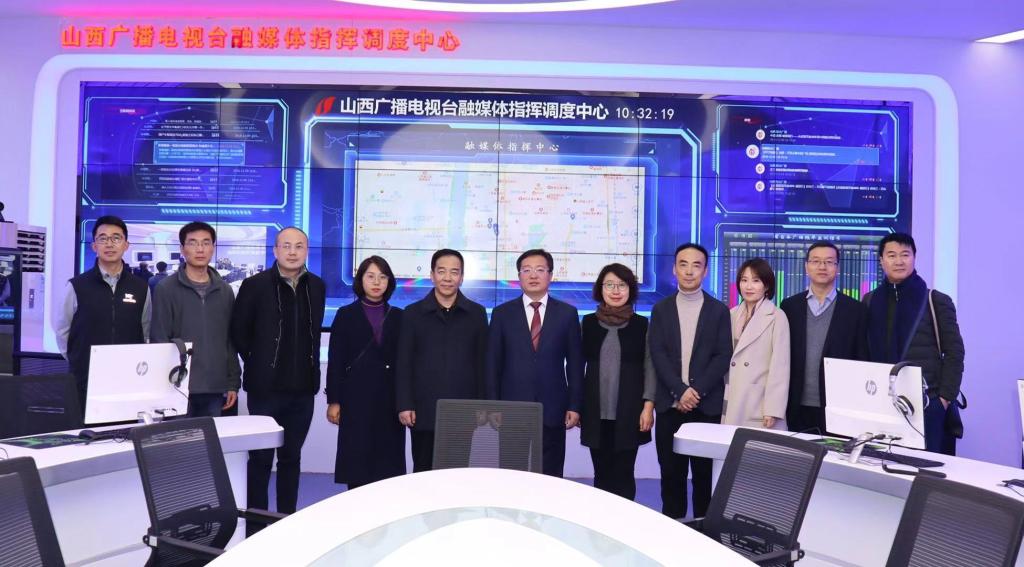 图4:康永刚书记(左六)、郝淑媛副书记(左七)等在山西广播电视台副台长张晋斌(左五)等陪同下参观该台融媒体指挥调度中心。