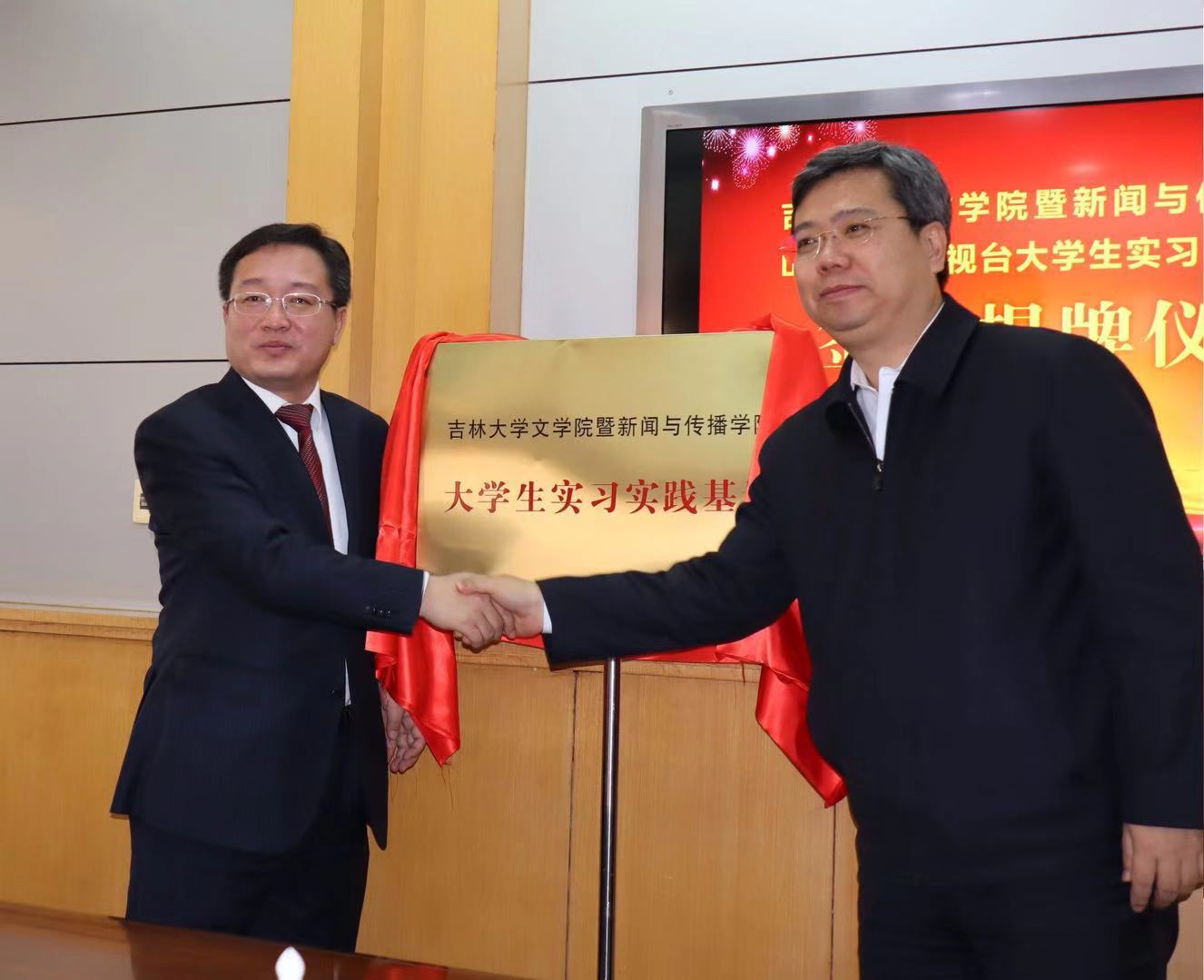 图2:3377官方网站_3377(中国)党委书记康永刚(左)和山西广播电视台党委书记、台长刘英魁共同为大学生实习实践基地揭牌。