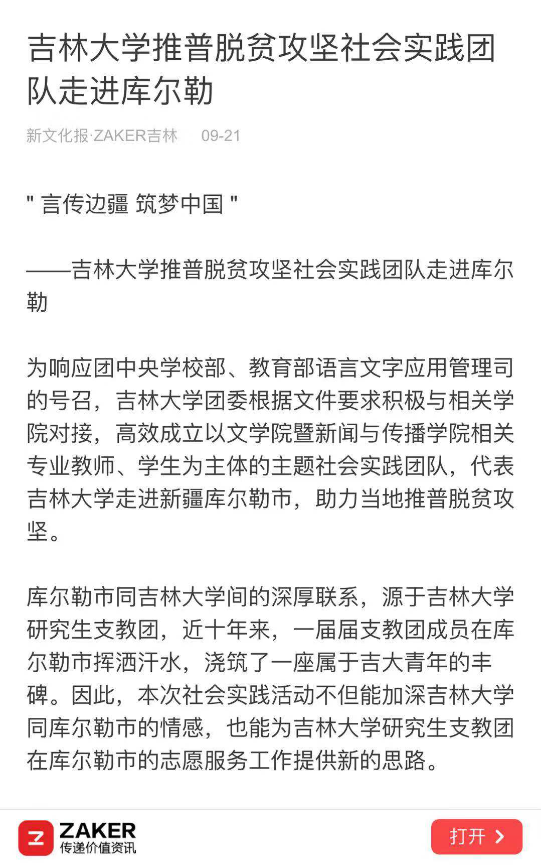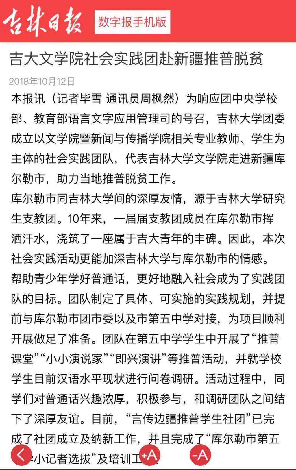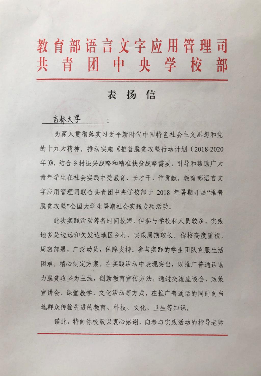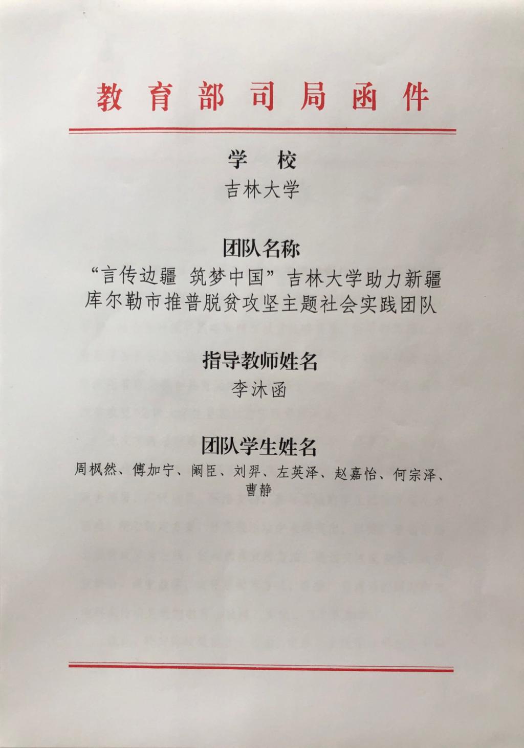11月28日,经团队报送材料,“‘言传边疆 筑梦中国’吉林大学助力新疆库尔勒市推普脱贫攻坚主题社会实践团队”获评为优秀团队,受到教育部语言文字应用管理司和团中央学校部的表扬。3377官方网站_3377(中国)团委定将以此为激励,继续在引导青年、志愿服务等方面发挥示范作用,成为帮助青年学生成长的优秀平台。