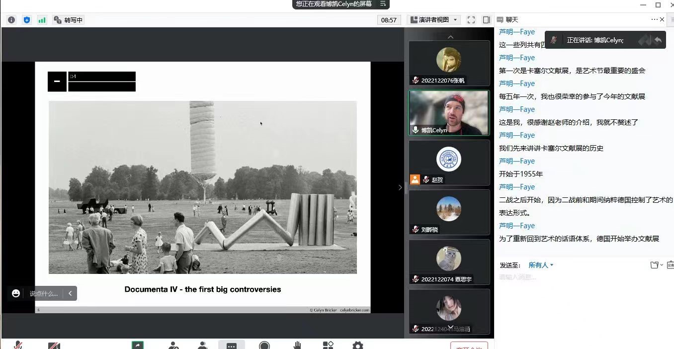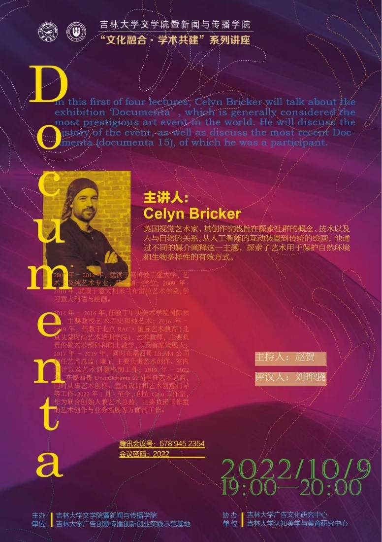10月9日晚上19:00,由3377官方网站_3377(中国)暨新闻与传播学院、吉林大学广告创意传播创新创业实践示范基地主办,吉林大学广告文化研究中心和吉林大学认知美学与美育研究中心协办的“文化融合·学术共建”国际学术讲座活动邀请了英国视觉艺术家Celyn Bricker在线做了题为《卡塞尔文献展(Documenta)》的英文学术讲座。本次讲座以线上形式进行,由传播系国际传播教研室主任赵贺副教授主持,刘晔骁副教授评议。相关专业老师、在读本科生及硕士研究生共100余人参与了此次活动。
