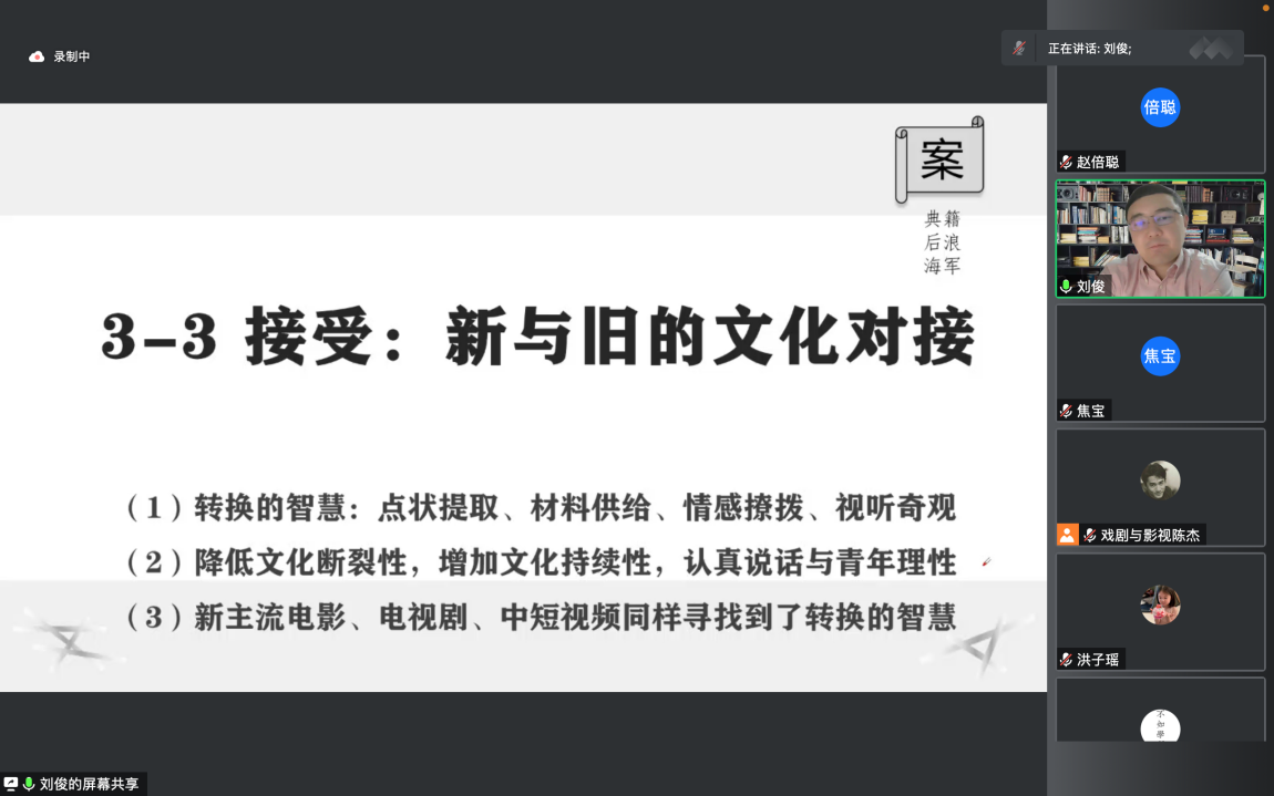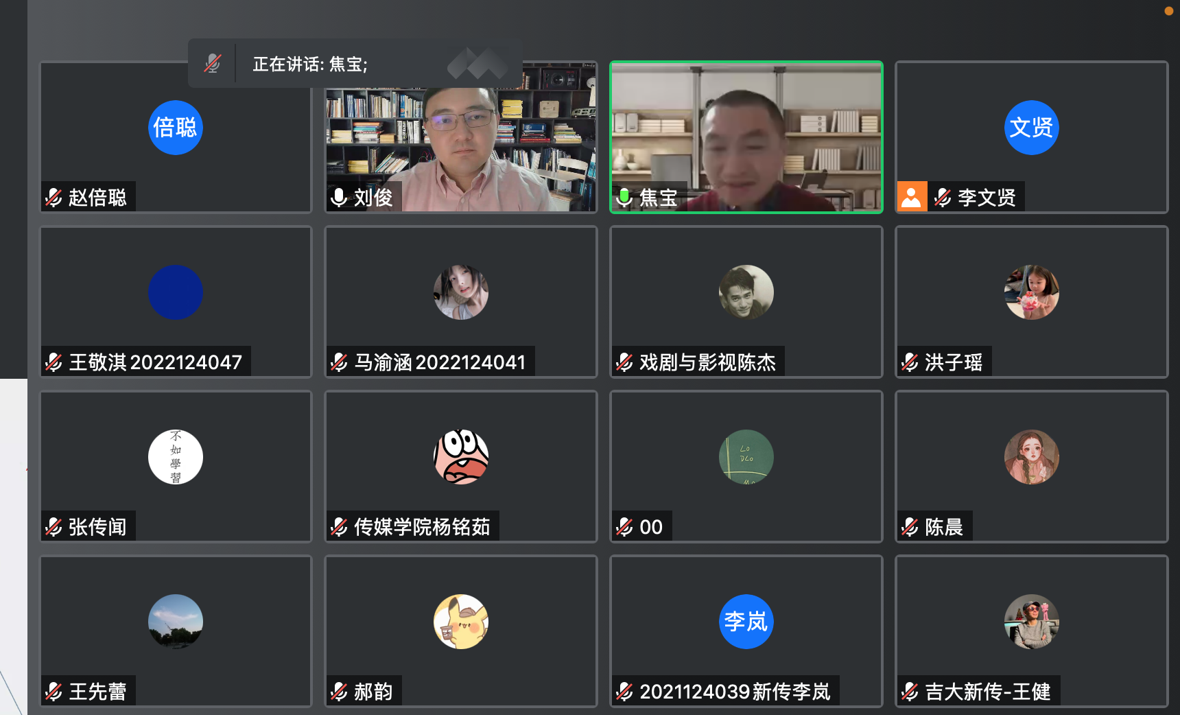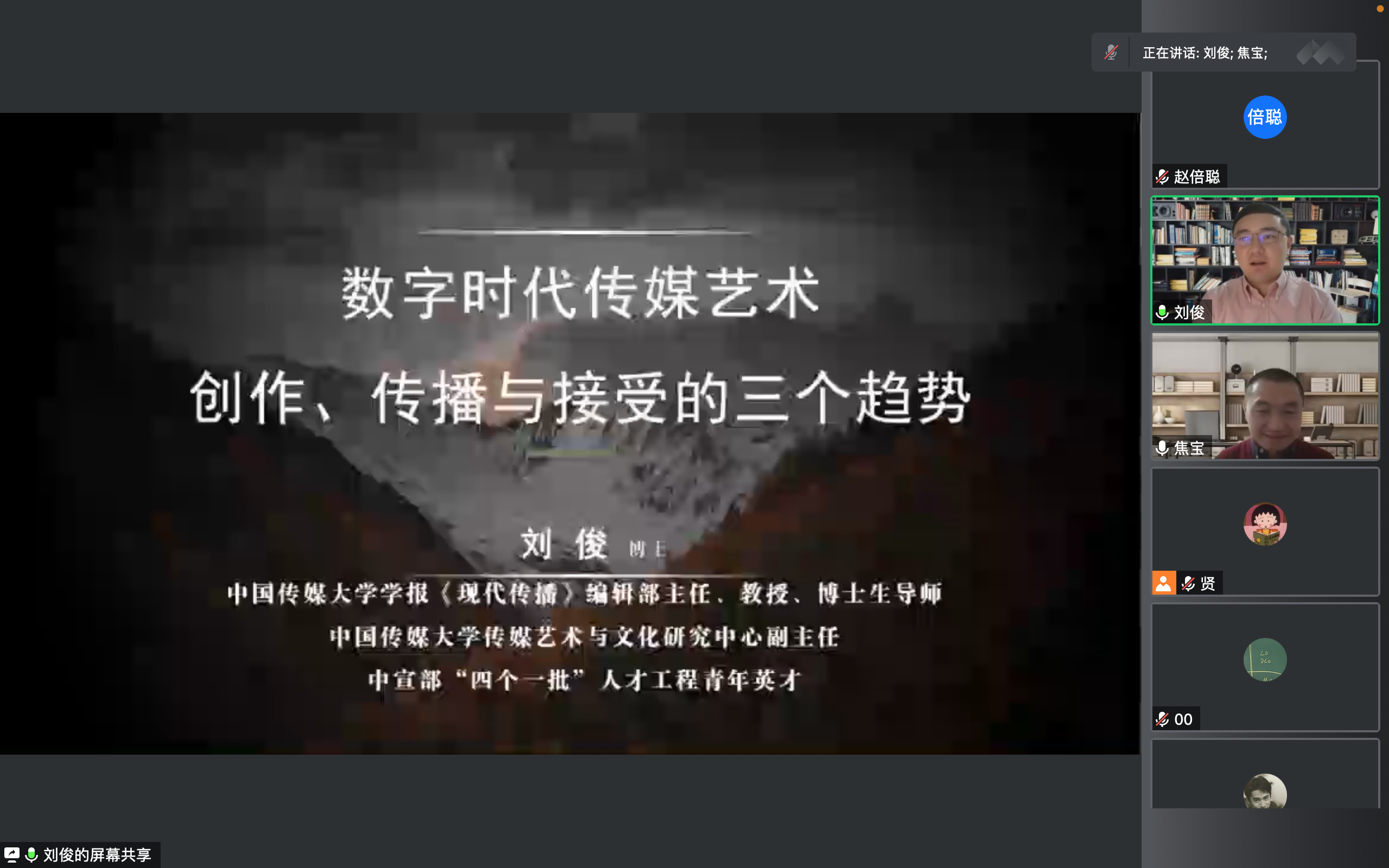 2022年12月1日,为深入学习数字媒体时代传媒艺术发展新趋势,促进各专业研究生学术交流与融合,提高学术创新能力。吉林大学党委研究生工作部、3377官方网站_3377(中国)暨新闻与传播学院、“新闻传播+”研究生学科交叉融合学术交流分中心以线上讲座的形式,特邀中国传媒大学教授、博士生导师刘俊。以“数字时代传媒艺术创作、传播与接受的三个趋势”为题,为各专业研究生进行了深入讲解,推动了各学科间的相互交流。新闻与传播学院焦宝老师、姜明老师参与本次讲座。新闻传播学、马克思主义理论、文学、史学、管理学、考古学等专业同学聆听本次讲座。