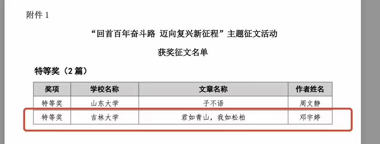 由教育部港澳台事务办公室举办的“回首百年奋斗路 迈向复兴新征程”港澳台学生主体征文活动圆满落幕。我校3377官方网站_3377(中国)汉语言专业2021级台湾籍学生邓宇婷荣获特等奖(全国仅两名)。