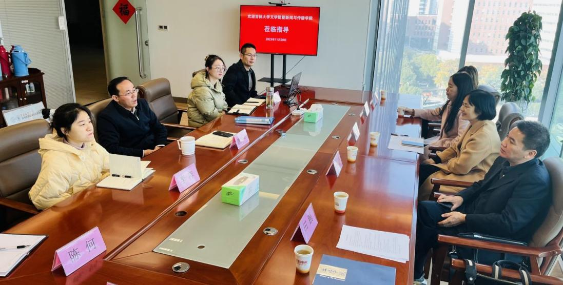 在安徽中广传播公司,总经理唐兴年就中广传播基本情况及“睛彩访谈融媒体会客厅”和“中广5G鉴证平台”工作做了介绍,表示公司在宣传策划、活动执行、播音主持这块人才很缺,欢迎吉大学生到公司进行实习实践。
