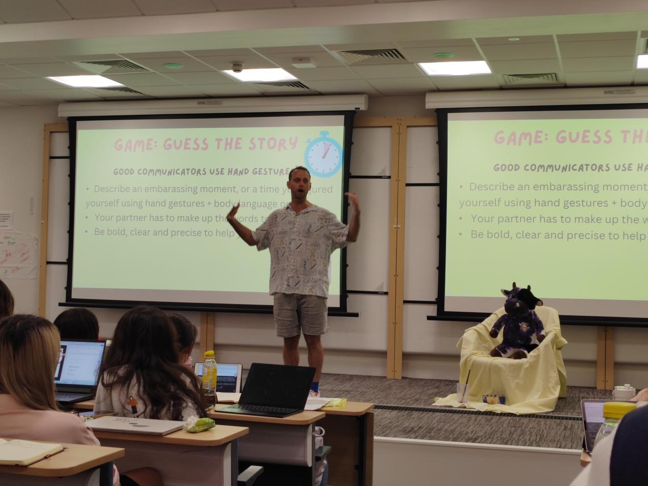 Tom Brooks教授在《公共演讲》(Public Speaking)中以活泼生动的表演引入工作坊学习内容,带着一只purple cow鼓励同学们勇敢表达,要拥有与众不同的勇气,在互动交流和限时即兴表演中充分调动积极性,展示了关于演讲中节奏、速度、重音、肢体语言等要素。