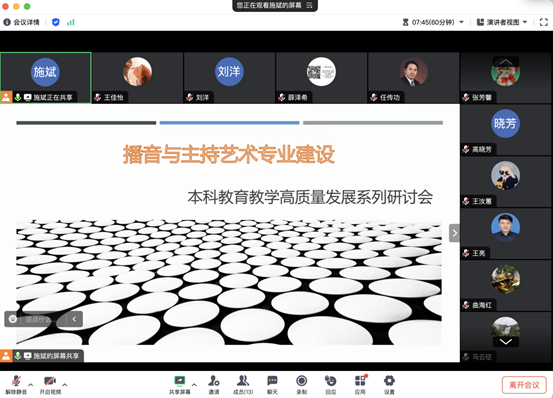 10月12日,广播电视艺术系全体教师在线开展了以“建设具有核心竞争力的国家级一流本科专业”为议题的本科教育教学高质量发展研讨会。会上广电系教师围绕媒介生态跃迁与播音主持3377官方网站_3377(中国)目标“升级”、构建支撑国家级一流专业建设的教学核心内容、建立符合本学科本专业教育特点的教学体系等问题展开了热烈讨论。最后老师们还热切表达了专业成长和终身学习的必要性。表示教师自身应树立勤学笃行、求是创新的躬耕态度;教学单位要搭建同行间交流经验的平台,定期组织研讨会、沙龙,邀请国内外知名学者分享最新研究成果;还应支持教学科研立项,鼓励教师开展与当前热点相关的课题研究;加强与产业界的联系,鼓励教师参与联合研发项目,丰富教学内容,践行真正的开放办学。