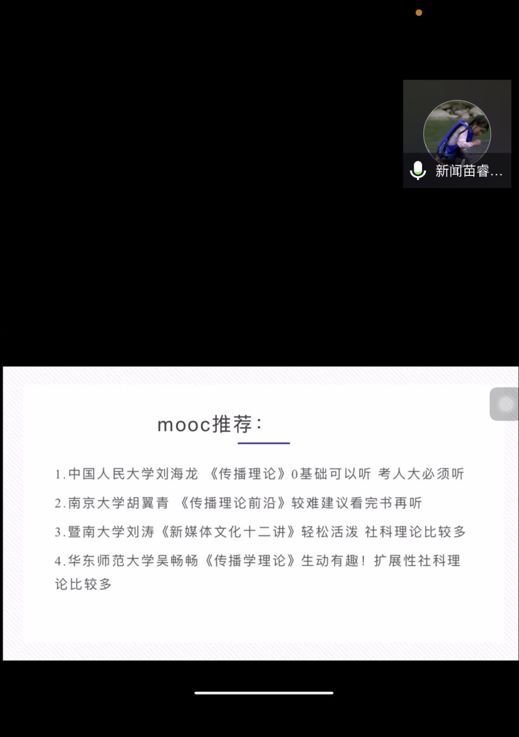 由于疫情原因,本次分享会全程线上举办,以主讲人用PPT进行个人陈述为主。各位主讲人就考研流程、院校选择、时间规划、复习纲领、心态调整等同学们关注的重点话题倾囊所授、毫无保留,并结合自身经历总结出考研复习过程中常见的几个误区、雷区,帮助同学少走弯路、错路。