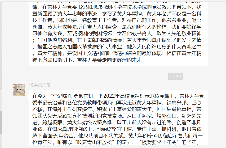 党支部副书记陈家佑在观看视频后表示:“经过此次观看我对黄大年精神有了更深的感悟。黄大年同志始终坚守爱国主义精神,矢志不渝实践科技报国的理想。无论是在读书求学、国外工作还是归国任教期间,都始终把祖国富强和民族振兴作为最高追求。姜治莹书记,于吉红院士等老师诠释了黄大年精神的精神内核,他心系祖国发展和吉林振兴,以战略视野和高尚人格为国家培养凝聚人才,为全国党员树立了旗帜,是高校教育工作者的杰出榜样。各校的展博课也非常精彩,生动的诠释了当代共产党员的时代精神,展现大学党员思想教育与实践教育的深入。也激励着学生党员向老一辈的先进工作者近一步学习,争做时代先锋,继续为祖国添砖加瓦,为人民服务。”