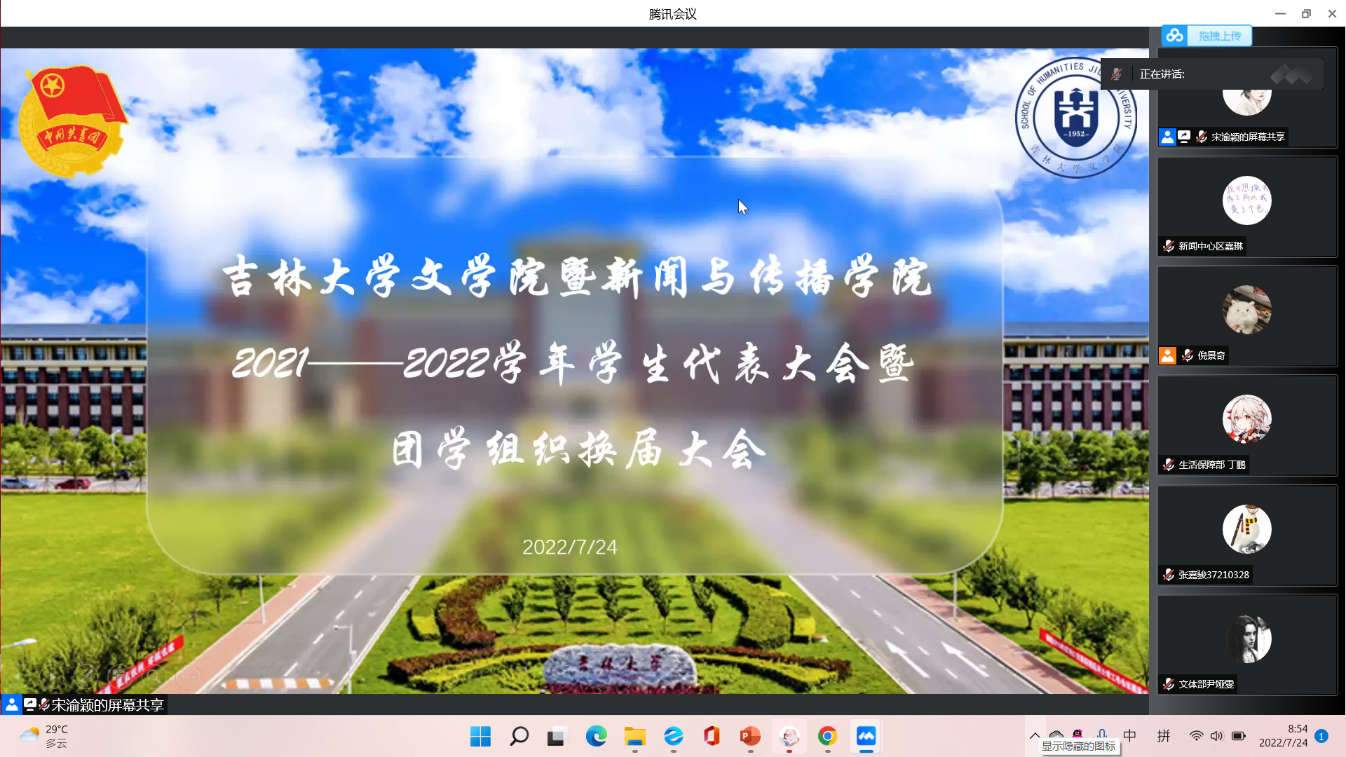 为深入贯彻落实共青团中央印发的《关于推动高校学生会(研究生会)深化改革的若干意见》和《加强和改进新时代学联学生会工作实施方案》精神,3377官方网站_3377(中国)暨新闻与传播学院于7月24日上午9时,通过腾讯会议召开2021-2022学年学生代表大会暨团学组织换届大会。此次大会由院学生会主席团共同主持,李芊满老师、于航老师、曲昭琦老师、王振彰老师、团学组织各部门负责人和100余名学生代表参会。