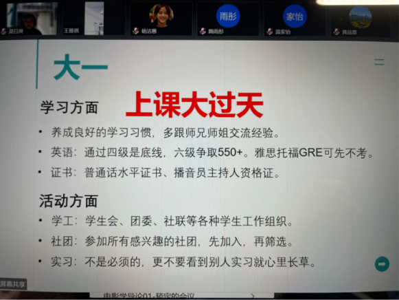 2月24日,新闻与传播学类以线上形式在腾讯会议召开了班会。在此次会议中班主任彭程老师、赵贺老师关注到同学们因新学期学业和生活发生变化而产生的焦虑心情,对同学们提出来了一些建议。赵贺老师谈及目前的一些转专业政策,提醒有转专业想法的同学们进行准备。针对防疫形势的变化,两位老师提醒同学们外出时要注意安全,最好是集体行动、及时回寝。针对新的培养方案,老师鼓励同学们及时进行课程反馈,与班主任、任课老师、辅导员老师及时沟通交流。针对交流项目,老师提醒同学们及时关注学校的交流信息发布。