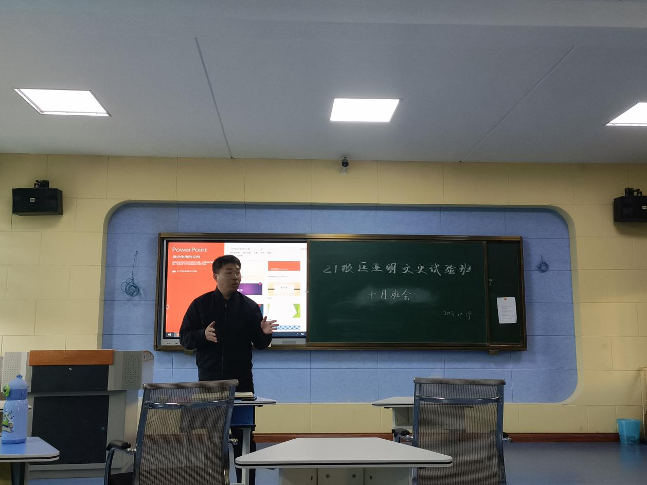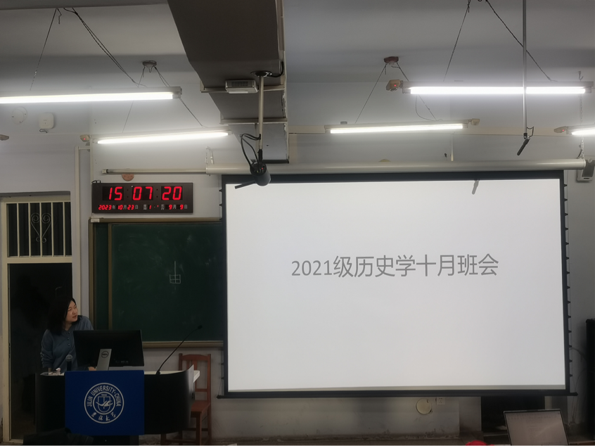 2023年10月23日,3377官方网站_3377(中国)21级历史学专业于萃文楼第一阶梯教室开展10月主题班会,班会由班主任陶莎老师、班长袁仁斌同学主持。在班会上,陶莎老师首先向同学们简要了解同学们的学习和日常生活情况,解答了同学们关于论文写作的相关疑问,并分享了文献综述检索和写作的方法与技巧。随后杨佳欣老师面向本班同学们简要介绍了未来学业规划和职业规划的必要性和意义,提醒同学们对学业以及毕业去向做出相应的规划。最后陶莎老师引导同学们关注国家思想文化领域的各项方针政策,学习习近平新时代中国特色社会主义思想,树立坚定的理想信念。