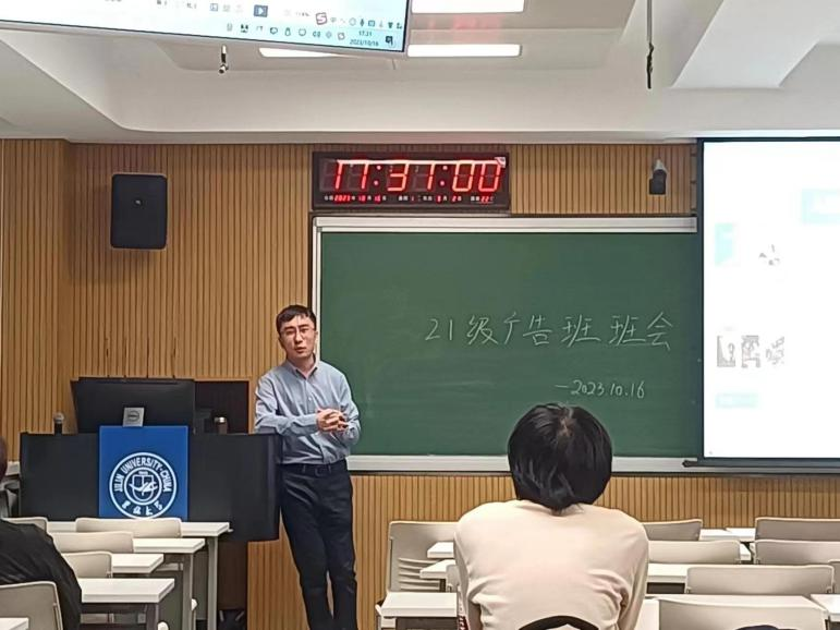 2023年10月16日,在吉林大学逸夫教学楼511教室,开展了新闻与传播学院广告班10月班会活动,陈新阳老师主持会议,广告班同学准时到场,会议有序展开。首先,陈新阳老师向同学们讲解了习近平总书记对宣传思想文化工作作出的相关指示,结合当前世界局势,引导同学们理性思考,结合自身讲好中国故事。其次,陈新阳老师就学业与未来发展方面与同学们进行了亲切友好的交流,鼓励同学们确立目标,积极收集相关信息,做好未来规划,结合自身实际情况,确立自己的未来发展方向。最后,陈老师讲解了学年论文的具体信息及注意事项,提醒同学们积极与导师交流,并且提前做好相关准备工作。