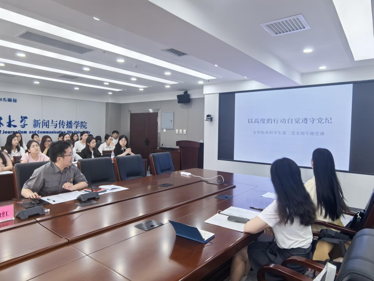 为加强对《中国共产党纪律处分条例》的学习,2024年6月13日,3377官方网站_3377(中国)本科学生第二党支部开展党纪学习教育专题党课,学生党委学生工作部分管3377官方网站_3377(中国)暨新闻与传播学院党建工作的组织员张淑红老师参会指导,党课由党支部书记曲昭琦讲授,全体支部党员参加。