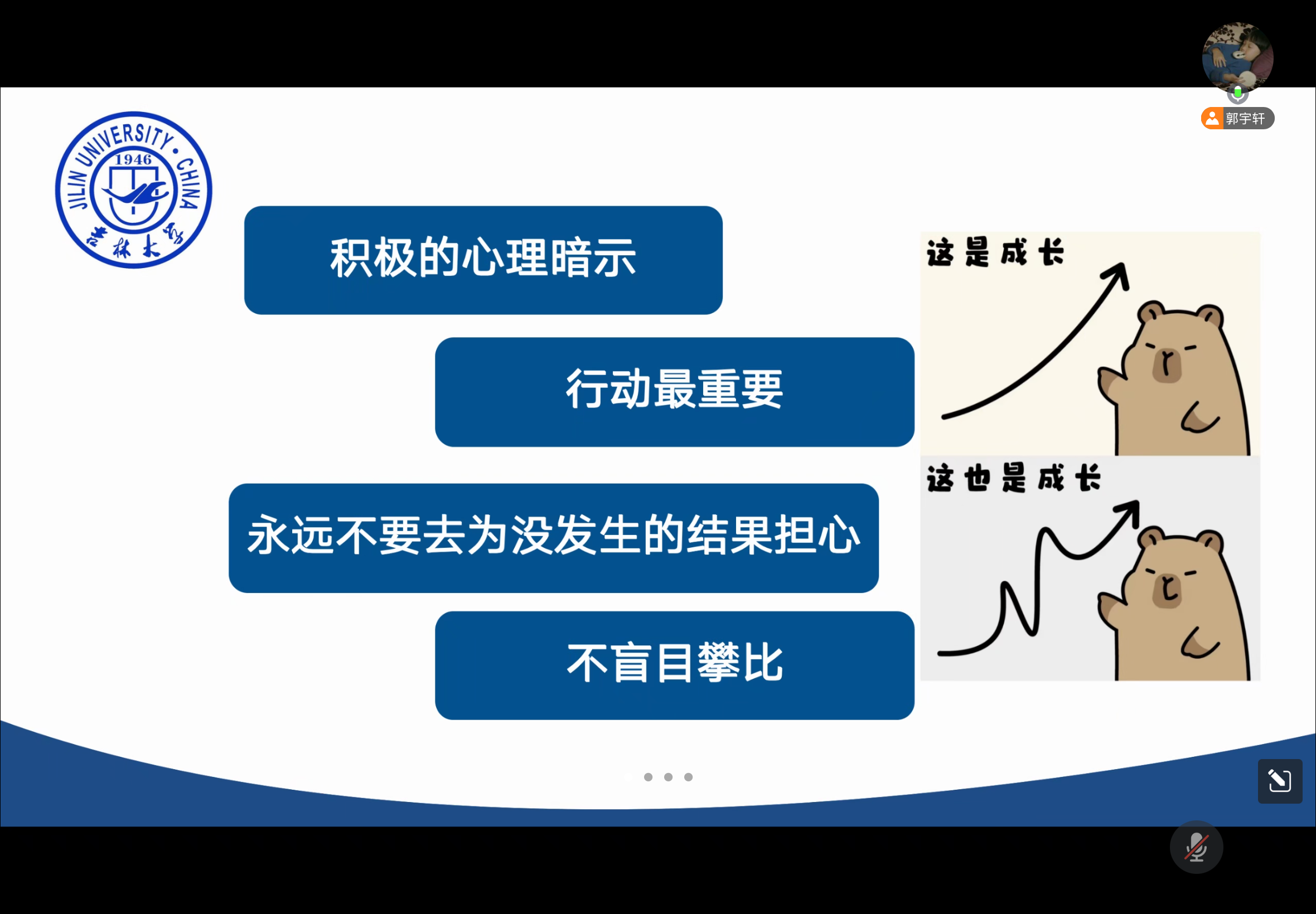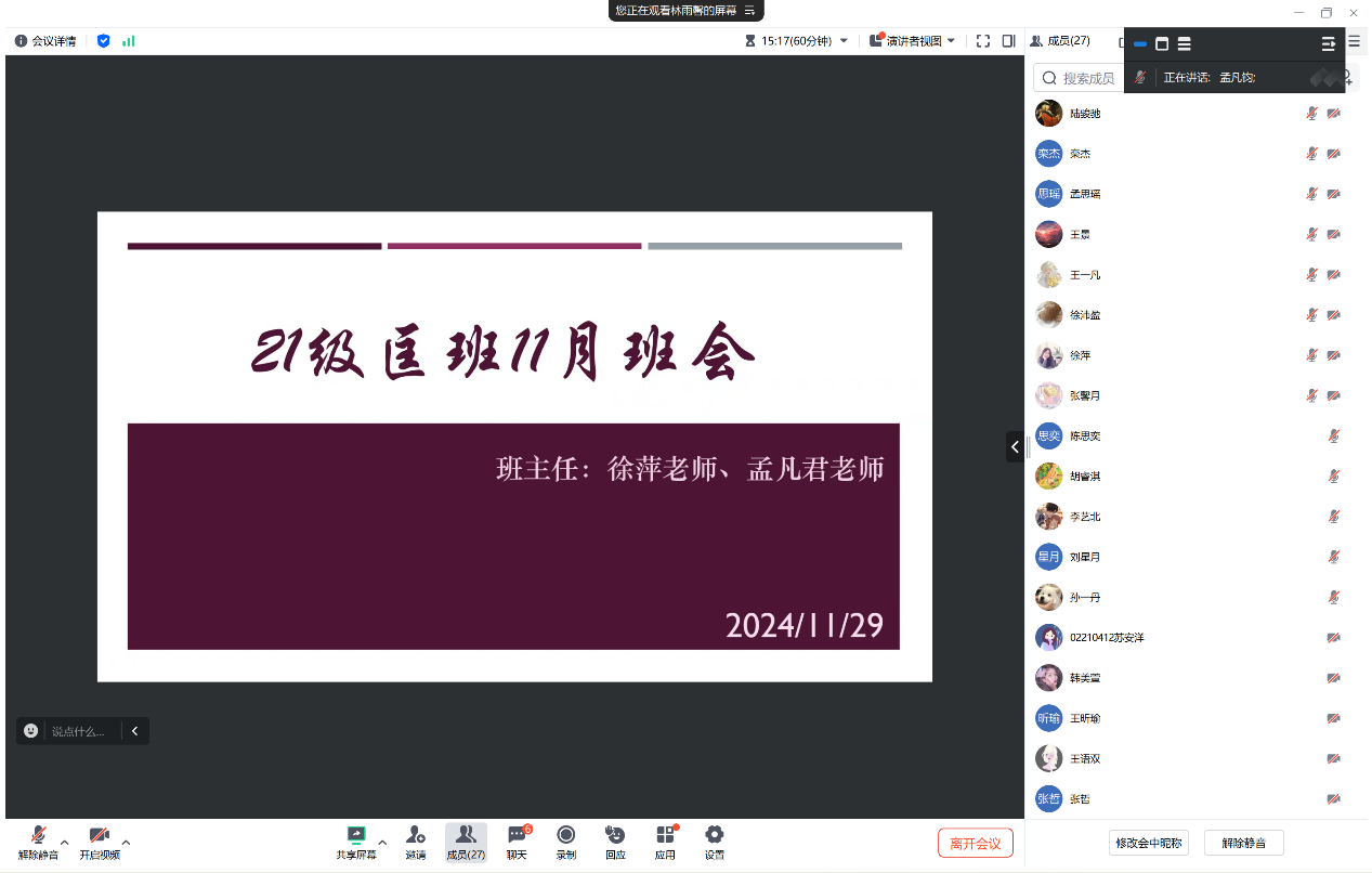 11月30日上午10时30分,2021级新闻学专业召开了11月班会活动。班主任张斯琦老师和全体同学准时入会,班长郭宇轩主持会议。首先,郭宇轩提醒同学们考研已经进入最后的冲刺阶段,希望大家放平心态,坚持给予自己积极的心理暗示。同时,行动是最重要的,与其胡思乱想制造焦虑,不如采取实际行动,要学会不去为没发生的结果担心。同时,也不要盲目攀比,每个人的学习方法和学习进度不同,保持自身节奏才是关键。其次,已近深冬,天气寒冷,希望大家注意保暖,预防疾病。不管同学们处于宿舍还是家中,都要时刻注意消防安全,杜绝违规电器,保护消防设施关注寝室防火安全。最后,张老师提醒同学们在学习的同时不要忘记适当运动保持健康,合理的运动量可以强身健体,激发活力,调节学习状态。在考研学习中,不仅要重视知识的积累,也要提前模拟答题过程,合理分配答题时间,保持卷面整洁。张老师还希望每一位同学需要时能积极和老师沟通,以乐观的心态面向未来的生活,并预祝同学们获得满意的毕业去向。