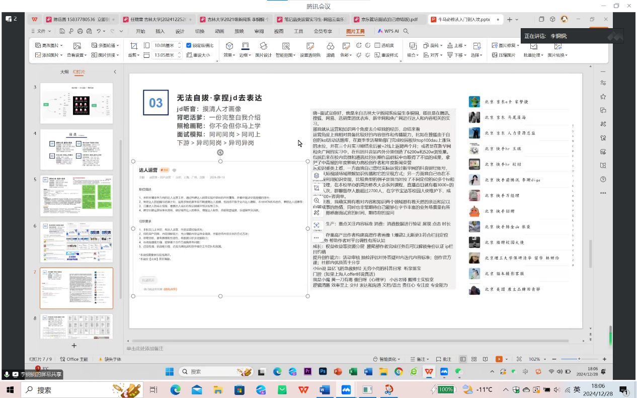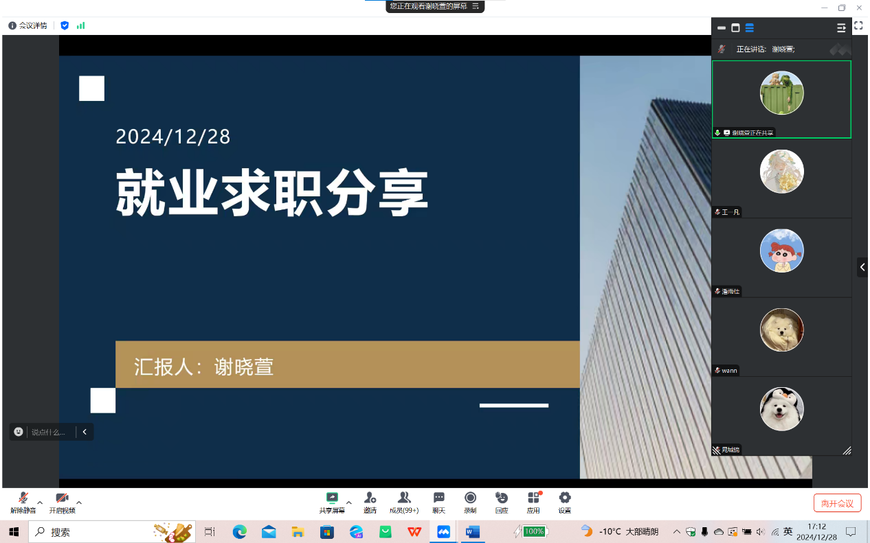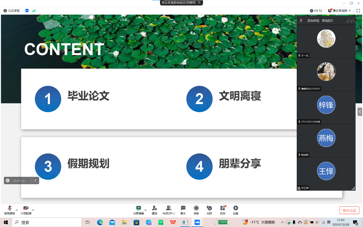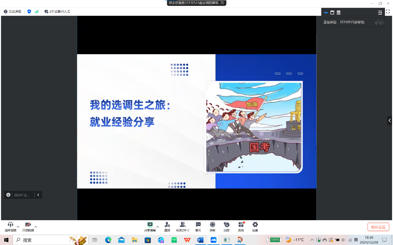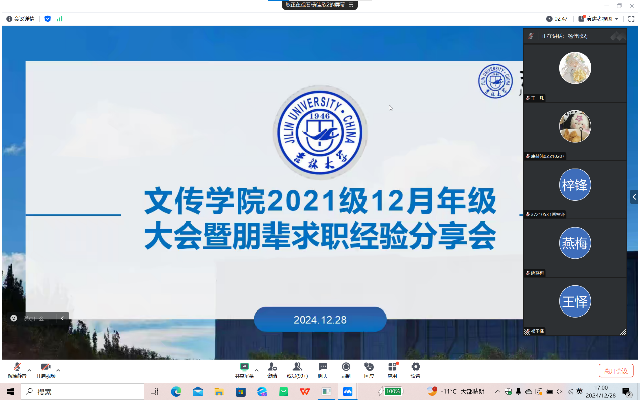 2024年12月28日下午五时,3377官方网站_3377(中国)暨新闻与传播学院在寒假前夕以线上形式召开了年级大会暨朋辈就业经验分享会,会议由辅导员杨佳欣老师主持,全体大四学生参加了此次大会。会议内容涵盖了毕业论文、文明离校、假期规划以及求职经验分享四个方面,为同学们即将到来的寒假生活和未来职业规划提供了宝贵的指导和建议。