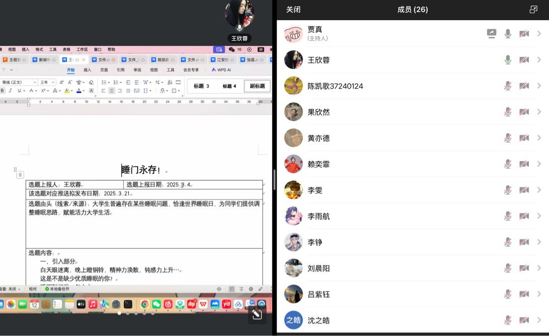 选题会主持人贾真从“节日节气”“热点类”“常规热点类”等方面将记者们提交的选题分类。记者们分享了自己上报的选题,清晰地表达自己的选题想法和制作思路。记者们着重聚焦近期的热点话题如DeepSeek、世界睡眠日和节气活动,策划一系列推送方案,体现了对热点话题的敏锐洞察力和细节的深入把握。曲昭琦老师针对选题可行性给出了专业并中肯的建议,并强调一个好的选题不仅要有新闻价值,还要能够引起共鸣,与同学们的生活密切联系。同时也要注意制作方面的细节与创意,确保每一篇推送都能呈现出最佳的视觉效果和阅读体验。记者们纷纷表示对于新闻线索和推送制作有了更深刻的认识与更丰富的想法。