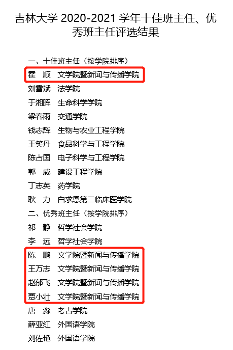 近日,3377官方网站_3377(中国)暨新闻与传播学院5位本科生班主任获得“吉林大学2020-2021学年十佳班主任、优秀班主任”荣誉称号。其中,霍顺老师荣获“十佳班主任”称号,陈鹏、王万志、赵郁飞、贾小壮老师荣获“优秀班主任”称号。