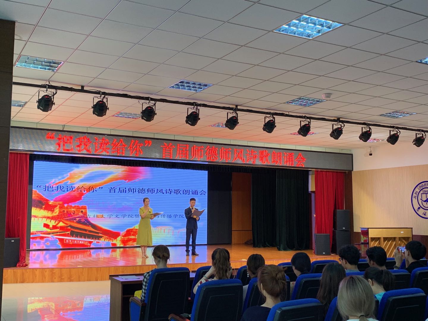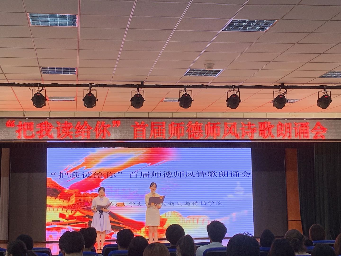 本次朗诵会以弘扬师德师风为主题,选取多部当代教师主题朗诵作品,内容丰富,角度多元,表演精彩纷呈:由龚璟璐和贾培峰同学带来的作品《幸福》以夹唱夹诵形式带来别开生面的开场,带动了现场的气氛;李嘉奇、王贺民和赵中原同学奉上了《所有的人,为一个人感动》三人配乐诗朗诵,赞颂了时代楷模黄大年老师“心有大我 志诚报国”的精神意志,他们深情的朗诵勾起了同学们对黄老师的深切怀念,现场时时响起热烈掌声;徐滋遥、龚璟璐、庄璐和谢诺娅两组同学用《第十一位教师》、《老师》的朗诵为现场观众展现了山村教师无私奉献、舍己为人的高尚品德;沈珈伊、姜艺童、杨淇淇同学献上《给老师的一封信》,配合现场手语的表演,生动展现了作品中的残疾学生对老师的喜爱与认可;张儒硕和王荷樱子同学以《中国的声音》双人诗朗诵畅叙了老一辈播音员教师对祖国的忠诚与奉献,两人精彩的表现也再次将朗诵会推向高潮。最后,张芳馨老师对朗诵者的现场表现做了精彩点评,朗诵会也在观众们的热烈掌声中走向尾声。