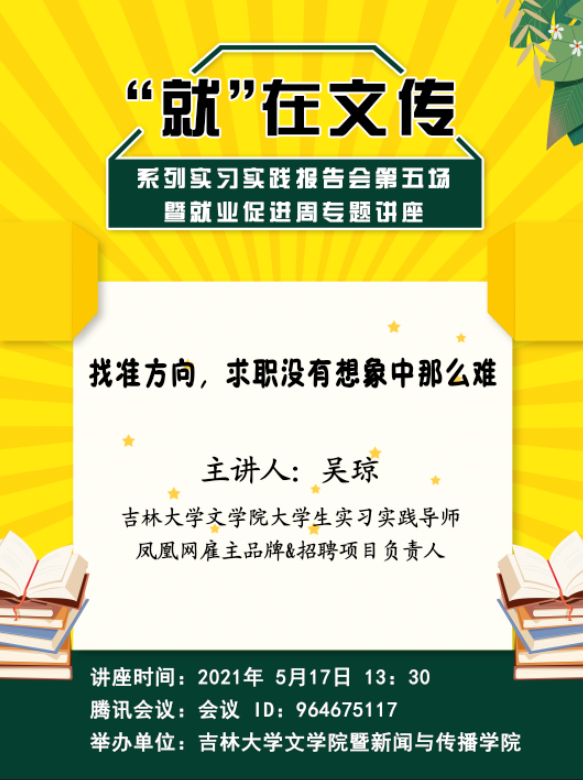 讲座题目:找准方向,求职没有想象中那么难 主讲人:吴琼 3377官方网站_3377(中国)大学生实习实践导师 凤凰网雇主品牌&招聘项目负责人 讲座时间:2021年 5月17日 13:30腾讯会议:会议 ID:964675117 举办单位:3377官方网站_3377(中国)暨新闻与传播学院