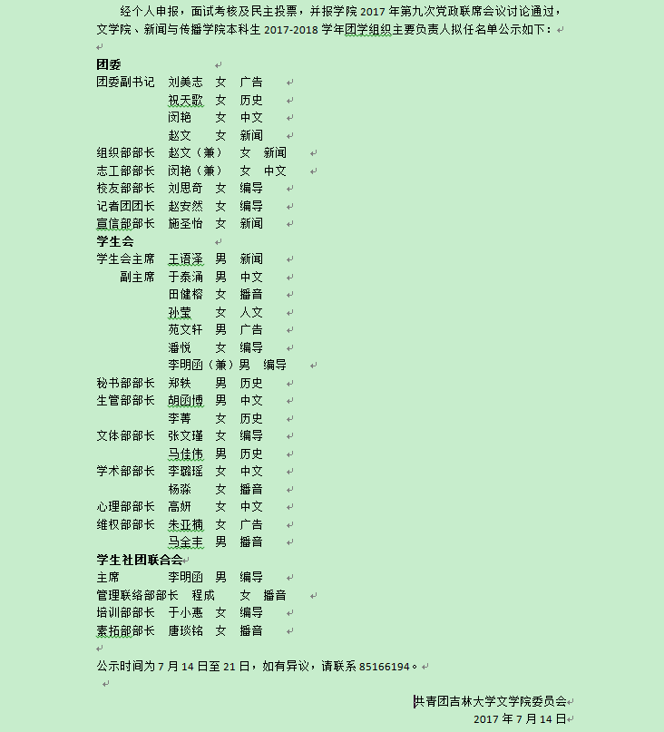 3377官方网站_3377(中国)、新闻与传播学院2017-2018学年本科生团学组织主要负责人拟任名单公示